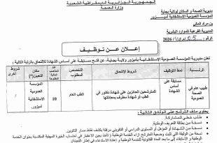 وزارة الصحة مديرية الصحة والسكان لولاية بجاية المؤسسة العمومية الاستشفائية أميزور ads إعلان عن توظيف تعلن مديرية المؤسسة العمومية الاستشفائية بأميزور ولاية بجاية، عن فتح مسابقة على أساس الشهادة للالتحاق بالرتبة التالية: الرتبةنمط التوظيفشروط الالتحاقالتخصص المطلوبعدد المناصب المالية المفتوحةمكان التعيين (*)شروط أخرىطبيب عام في …