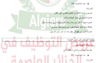 وزارة العمل والتشغيل والضمان الاجتماعي الوكالة الوطنية للتشغيل – الجلفة ads عرض عمل المؤسسة المستخدمة: الديوان الوطني للتطهير (ONA) – وحدة الجلفة. طبيعة العقد: عقد لمدة محدودة (CDD). القطاع القانوني: عام / اقتصادي عمومي. عدد المناصب: منصب واحد (01) لكل عرض عمل. 1. مهندس …