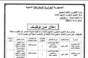 وزارة التكوين والتعليم المهنيين مركز التكوين المهني و التمهين للإناث ولد قبيلة صليحة معسكر ads إعلان عن توظيف يعلن مركز التكوين المهني و التمهين للإناث ولد قبيلة صليحة معسكر عن تنظيم مسابقة للتوظيف على أساس الاختبار المهني لسنة 2025 في المناصب المبينة في الجدول …