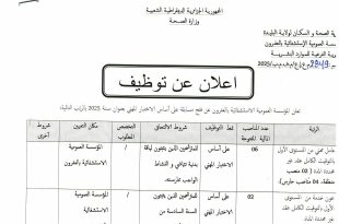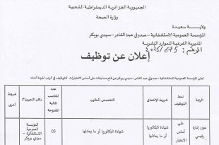 وزارة الصحة المؤسسة العمومية الاستشفائية-صدوقي عبد القادر-سيدي بوبكر ولاية سعيدة ads إعلان عن توظيف تعلن المؤسسة العمومية الاستشفائية-صدوقي عبد القادر-سيدي بوبكر عن فتح مسابقات على أساس الإختبارات للتوظيف في الرتب المبينة أدناه: إعلان عن توظيف بالمجلس الأعلى للشباب: الجزائر العاصمة، البليدة، تيبازة، بومرداس. إعلان …