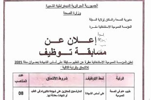 وزارة الصحة مديرية الصحة والسكان لولاية المسيلة المؤسسة العمومية الاستشفائية مقرة ads إعلان عن مسابقة توظيف تعلن المؤسسة العمومية الاستشفائية مقررة عن تنظيم مسابقة على أساس الشهادة بعنوان سنة 2025 للالتحاق بالرتبة التالية: الرتبةنمط التوظيفشروط الالتحاقعدد المناصبطبيب عام في الصحة العموميةعلى أساس الشهادةالمترشحين الحائزين …