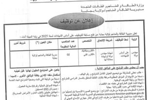 وزارة الطاقة والمناجم و الطاقات المتجددة مديرية الطاقة و المناجم لولاية بجاية ads إعلان عن توظيف تعلن مديرية الطاقة والمناجم لولاية بجاية عن فتح مسابقة للتوظيف على أساس الشهادات لسنة 2025 في رتبة مبينة أدناه: الرتبةنمط التوظيفشروط الإلتحاقعدد المناصب المفتوحةمكان التعيينشروط أخرىمهندس دولة مسابقة …