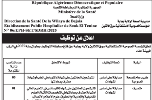 وزارة الصحة مديرية الصحة لولاية بجاية المؤسسة العمومية الاستشفائية سوق الاثنين ads إعلان عن توظيف تعلن المؤسسة العمومية الاستشفائية سوق الاثنين لولاية بجاية عن فتح مسابقة التوظيف بعنوان سنة 2025 في الرتب المبينة أدناه: الرتبةعدد المناصب المفتوحةنمط التوظيفشروط الالتحاقطبيب عام للصحة العمومية05مسابقة على أساس …