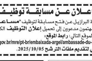 إعلان عن مسابقة توظيف ads تعلن سفارة البرازيل عن فتح مسابقة لتوظيف “مساعد إداري”. الأشخاص المهتمون مدعوون إلى تحميل إعلان التوظيف الكامل واستمارة الموعد النهائي لتقديم ملفات الترشح 2025/10/05. التسجيل من الموقع التالي رابط الموقع: https://www.gov.br/mre/pt-br/embaixada-argel/ambassade-du-bresil-a-alger إعلان عن توظيف بالمجلس الأعلى للشباب: الجزائر العاصمة، …