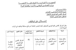 وزارة التضامن الوطني والأسرة وقضايا المرأة. ads إعلان عن توظيف يعلن المركز المتخصص في إعادة التربية بنات حي بن عاشور البليدة عن فتح مسابقة توظيف في الرتب المبينة أدناه: الرتبةنمط التوظيفشروط التوظيفعدد المناصب الماليةمكان التعيينشروط أخرىملحق رئيسي للإدارةعلى أساس الشهادةالحائزون على شهادة تقني سامي …