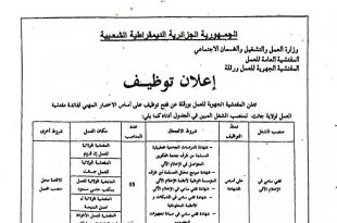 الجمهورية الجزائرية الديمقراطية الشعبية وزارة العمل والتشغيل والضمان الاجتماعي المفتشية العامة للعمل المفتشية الجهوية للعمل ورقلة ads إعلان توظيف تعلن المفتشية الجهوية للعمل بورقلة عن فتح توظيف على أساس الاختبار المهني لفائدة مفتشية العمل لولاية جانت لمنصب الشغل المبين في الجدول أدناه كما يلي: …