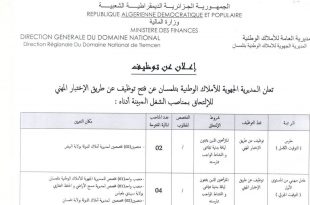 الجمهورية الجزائرية الديمقراطية الشعبية وزارة المالية المديرية العامة للأملاك الوطنية المديرية الجهوية للأملاك الوطنية بتلمسان ads إعلان عن توظيف تعلن المديرية الجهوية للأملاك الوطنية بتلمسان عن فتح توظيف عن طريق الاختبار المهني للإلتحاق بمناصب الشغل المبينة أدناه: الرتبةنمط التوظيفشروط الإلتحاقعدد المناصب المالية المفتوحةالتخصص المطلوبمكان …