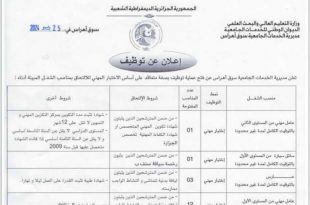 الجمهورية الجزائرية الديمقراطية الشعبية وزارة التعليم العالي والبحث العلمي الديوان الوطني للخدمات الجامعية مديرية الخدمات الجامعية سوق أهراس ads إعلان عن توظيف تعلن مديرية الخدمات الجامعية سوق أهراس عن فتح عملية توظيف بصفة متعاقد على أساس الاختيار المهني للالتحاق بمناصب الشغل المبينة أدناه: جميع …