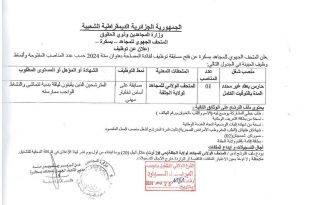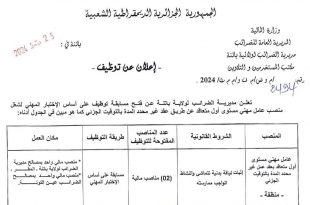 الجمهورية الجزائرية الديمقراطية الشعبية وزارة المجاهدين وذوي الحقوق المتحف الجهوي للمجاهد – بسكرة ads إعلان عن توظيف يعلن المتحف الجهوي للمجاهد بسكرة عن فتح مسابقة توظيف لفائدة المصلحة بعنوان سنة 2024 حسب عدد المناصب المفتوحة وأنماط الوظيف المبينة في الجدول التالي: الشهادة أو المؤهل …