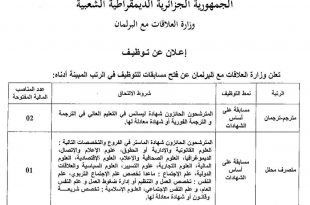 الجمهورية الجزائرية الديمقراطية الشعبية وزارة العلاقات مع البرلمان إعلان عن توظيف ads تعلن وزارة العلاقات مع البرلمان عن فتح مسابقات للتوظيف في الرتب المبينة أدناه: الرتبةنمط التوظيفشروط الالتحاقعدد المناصب المالية المفتوحةمترجم-ترجمانمسابقة على أساس الشهاداتالمترشحون الحائزون شهادة ليسانس في التعليم العالي في الترجمة والترجمة الفورية …