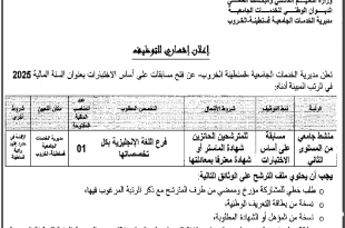 وزارة التعليم العالي والبحث العلمي الديوان الوطني للخدمات الجامعية مديرية الخدمات الجامعية قسنطينة – الخروب ads إعلان إشهاري للتوظيف تعلن مديرية الخدمات الجامعية قسنطينة-الخروب عن فتح مسابقات على أساس الاختبارات بعنوان السنة المالية 2025 في الرتب المبينة أدناه: الرتبنمط التوظيفشروط الالتحاقالتخصص المطلوبالمناصب المالية المفتوحةمكان …