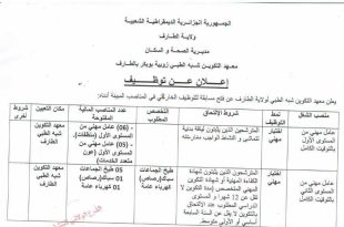 وزارة التكوين والتعليم المهنيين المعهد الوطني المتخصص في التكوين المهني سيدي بلعباس 02 – لعين ميلود ads إعلان عن توظيف يعلن المعهد الوطني المتخصص في التكوين المهني بسيدي بلعباس 02 لعين ميلود عن فتح مسابقة توظيف على أساس الاختبار المهني للالتحاق بمنصب العمل المذكور …