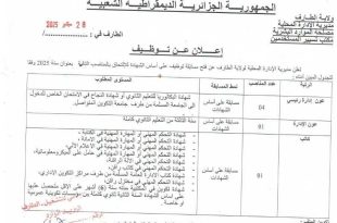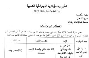 وزارة العمل والتشغيل والضمان الاجتماعي ولاية بسكرة مديرية التشغيل مصلحة الإدارة العامة والميزانية ads إعلان عن توظيف تعلن مديرية التشغيل لولاية بسكرة عن فتح مسابقة توظيف خارجية بصفة متعاقد على أساس الإختيار المهني للإلتحاق بمنصب عامل مهني من المستوى الأول بالتوقيت الكامل بعقد غير …