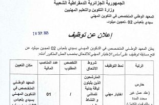 أكمل القراءة »إعلان عن توظيف بالمعهد الوطني المتخصص في التكوين المهني سيدي بلعباس 02