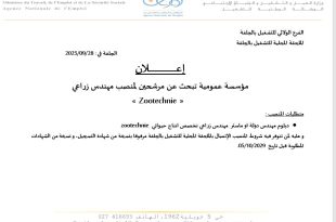 وزارة العمل والتشغيل والضمان الاجتماعي الوكالة الوطنية للتشغيل الفرع الولائي للتشغيل بالجلفة الملحقة المحلية للتشغيل بالجلفة ads إعلان مؤسسة عمومية تبحث عن مرشحين لمنصب مهندس زراعي « Zootechnie » متطلبات المنصب: دبلوم مهندس دولة أو ماستر مهندس زراعي تخصص إنتاج حيواني zootechnie وعليه لمن …