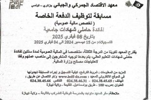 معهد الاقتصاد الجمركي والجبائي الجزائري – تونسي مسابقة توظيف دفعة خاصة ( تخصص مالية عمومية ) لفائدة حاملي شهادات جامعية تاريخ 08 فيفري 2025 التسجيلات من 15 ديسمبر 2024 إلى 04 فيفري 2025 ads يقترح المعهد تكوينا من الدرجة الثالثة، متخصصا في المالية العمومية …