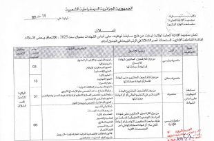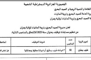 وزارة الفلاحة والتنمية الريفية والصيد البحري المديرية العامة للصيد البحري وتربية المائيات مديرية الصيد البحري وتربية المائيات لولاية وهران ads اعلان عن توظيف تعلن مديرية الصيد البحري وتربية المائيات لولاية وهران عن تنظيم مسابقات توظيف بعنوان سنة 2025 للالتحاق بالمناصب التالية: الرقمتعيين الرتبةعدد المناصبشروط …
