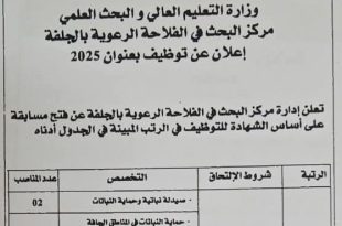 وزارة التعليم العالي والبحث العلمي مركز البحث في الفلاحة الرعوية بالجلْفة ads إعلان عن توظيف بعنوان 2025 تعلن إدارة مركز البحث في الفلاحة الرعوية بالجلْفة عن فتح مسابقة على أساس الشهادة للتوظيف في الرتبة المبينة في الجدول أدناه الرتبةشروط الإلتحاقالتخصصعدد المناصبأستاذ بحث قسم “ب”الحائزين …