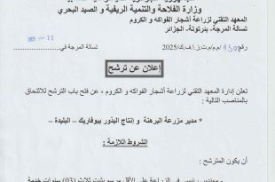 وزارة الفلاحة والتنمية الريفية والصيد البحري المعهد التقني لزراعة أشجار الفواكه و الكروم تسالـة المرجـة – بـرتـوتـة ـ الجزائـر ads إعلان عن ترشح تعلن إدارة المعهد التقني لزراعة أشجار الفواكه والكروم، عن فتح باب الترشح للالتحاق بالمناصب التالية: مدير مزرعة البرهنة و إنتاج البذور …