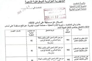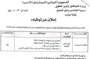 الجمهورية الجزائرية الديمقراطية الشعبية وزارة المجاهدين وذوي الحقوق مديرية المجاهدين وذوي الحقوق لولاية توقرت ads إعلان عن توظيف تعلن مديرية المجاهدين وذوي الحقوق لولاية توقرت عن فتح مسابقة للتوظيف على أساس الشهادة في المناصب المبينة أدناه: جميع مسابقات وإعلانات التوظيف نوفمبر 2025 إعلان عن …