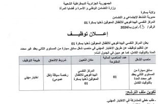 الجمهورية الجزائرية الديمقراطية الشعبية وزارة التضامن الوطني والأسرة وقضايا المرأة مديرية النشاط الاجتماعي والتضامن لولاية بسكرة المركز النفسي البيداغوجي للأطفال المعوقين ذهنيا بسكرة ads إعلان عن توظيف يعلن المركز النفسي البيداغوجي للأطفال المعوقين ذهنيا بسكرة عن تنظيم توظيف عن طريق الاختبار المهني في منصب …