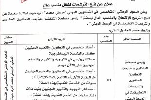 مديرية التكوين والتعليم المهنيين المعهد الوطني المتخصص في التكوين المهني “مرسلي محمد” الرياحية – سعيدة ads إعلان عن فتح الترشحات لشغل منصب عال يعلن المعهد الوطني المتخصص في التكوين المهني “مرسلي محمد” الرياحية لولاية سعيدة عن فتح الترشح للالتحاق لمنصبين عاليين إعلان عن توظيف …