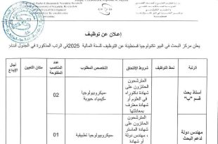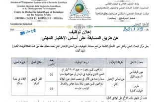 وزارة التعليم العالي والبحث العلمي المديرية العامة للبحث العلمي والتطوير التكنولوجي مركز البحث العلمي والتقني حول المناطق القاحلة ads إعلان توظيف عن طريق المسابقة على أساس الإختيار المهني يعلن مركز البحث العلمي والتقني حول المناطق القاحلة عن فتح مسابقة للتوظيف على أساس الإختيار المهني …