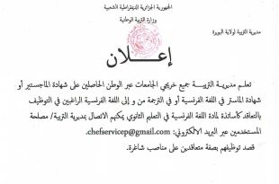 أكمل القراءة »اعلان عن توظيف بالتعاقد لأساتذة لمادة اللغة الفرنسية في التعليم الثانوي