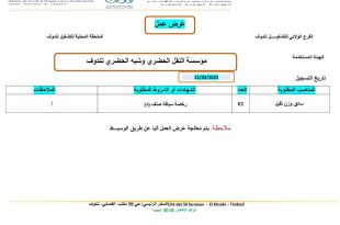 وزارة العمل والتشغيل والضمان الاجتماعي الوكالة الوطنية للتشغيل الفرع الولائي للتشغيل تندوف الملحقة المحلية للتشغيل تندوف ads عرض عمل الهيئة المستخدمة مؤسسة النقل الحضري وشبه الحضري تندوف تاريخ التسجيل 25/09/2025 المناصب المطلوبةالعددالشهادات أو الشروط المطلوبةالملاحظاتسائق وزن ثقيل02رخصة سياقة صنف (د)/ ملاحظة: يتم معالجة عرض …