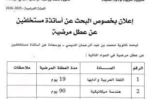 وزارة التربية الوطنية مديرية التربية لولاية المسيلة ثانوية محمد بن عبد الرحمان الديسي – بوسعادة السنة الدراسية: 2025-2026 ads إعلان بخصوص البحث عن أساتذة مستخلفين عن عطل مرضية تبحث ثانوية محمد بن عبد الرحمان الديسي – بوسعادة عن أساتذة مستخلفين عن عطل مرضية في …