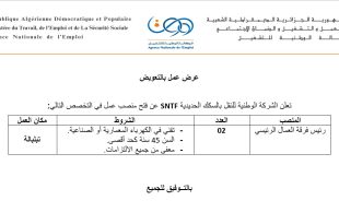 وزارة العمل والتشغيل والضمان الاجتماعي الوكالة الوطنية للتشغيل ads عرض عمل بالتعويض تعلن الشركة الوطنية للنقل بالسكك الحديدية SNTF عن فتح منصب عمل في التخصص التالي: المنصبالعددالشروطمكان العملرئيس فرقة العمال الرئيسي02– تقني في الكهرباء المعمارية أو الصناعية.– السن 45 سنة كحد أقصى.– معفى من …