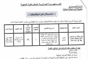 وزارة الـتربية الـوطنية مديرية الري لولاية بسكرة ads إعــلان عن تـوظـيـف تعلن مديرية الري لولاية بسكرة عن فتح مسابقة للتوظيف بعنوان سنة 2025 في المناصب الشغل المبينة أدناه: منصب الشغلنمط التوظيفشروط الإلتحاقالتخصص المطلوبعدد المناصب المفتوحةمكان التعيينشروط أخرىعون وقاية من المستوى الأول بالتوقيت الكامل بعقد …