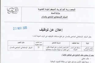 وزارة الصحة المركز الاستشفائي الجامعي بتلمسان ads إعلان عن توظيف يعلن المركز الاستشفائي الجامعي بتلمسان عن فتح مسابقات للتوظيف في الرتب المبينة أدناه: الرتبةنمط التوظيفشروط الإلتحاقعدد المناصب المالية المفتوحةمكان التعيينطبيب عام في الصحة العموميةمسابقة على أساس الشهادةالمترشحون الحائزون على شهادة دكتوراه في الطب أو …