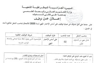 وزارة التعليم العالي والبحث العلمي جامعة علي كافي تندوف ads إعلان عن توظيف تعلن جامعة علي كافي تندوف عن عملية توظيف على أساس إختيار المهنئ لسنة 2025 للالتحاق بمناصب الشغل المذكورة أدناه في الجدول: مناصب الشغلعدد المناصبطرق التوظيفشروط التوظيف المطلوبةعامل مهني من المستوى الأول02على …