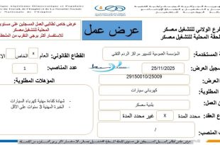 وزارة العمل والتشغيل والضمان الاجتماعي الوكالة الوطنية للتشغيل الفرع الولائي للتشغيل معسكر الملحقة المحلية للتشغيل معسكر ads عرض عمل الهيئة المستخدمة: المؤسسة العمومية لتسيير مراكز الردم التقني تاريخ تسجيل العرض: 25/11/2025 رقم العرض: 29150010/25009 المهنة المطلوبة: كهربائي سيارات مكان العمل: بلدية معسكر نوع العقد: …