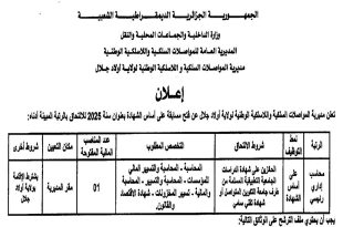 وزارة الداخلية والجماعات المحلية والتهيئة العمرانية المديرية العامة للمواصلات السلكية واللاسلكية الوطنية مديرية المواصلات السلكية واللاسلكية الوطنية لولاية أولاد جلال ads إعلان تعلن مديرية المواصلات السلكية واللاسلكية الوطنية لولاية أولاد جلال عن فتح مسابقة على أساس الشهادة بعنوان سنة 2025 للالتحاق بالرتبة المبينة أدناه: …