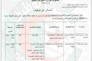 وزارة الصحة مديرية الصحة والسكان لولاية الأغواط ads إعلان عن مسابقة على أساس الشهادة 2025 تعلن مديرية الصحة والسكان لولاية الأغواط عن فتح مسابقة للتوظيف على أساس الشهادة للالتحاق بالرتبة التالية: الرتبةالعددالمؤسسة المعنيةشروط التوظيفنمط التوظيفطبيب عام في الصحة العمومية03مديرية الصحة والسكان لولاية الأغواطمن بين …
