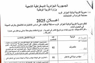بلاغ هام وزارة التربية الوطنية ads تمديد استثنائي لآجال التسجيل في مسابقات التوظيف على أساس الشهادات للالتحاق برتب الأساتذة بعنوان سنة 2025، لفائدة بعض مديريات التربية التي سجلت عجزًا في عدد المترشحين مقارنة بعدد المناصب المفتوحة. فترة التمديد من الخميس 15 جانفي 2026 إلى …