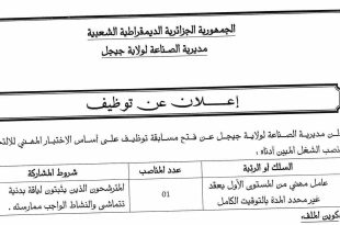 مديرية الصناعة لولاية جيجل ads إعلان عن توظيف تعلن مديرية الصناعة لولاية جيجل عن فتح مسابقة توظيف على أساس الاختبار المهني للالتحاق بمنصب الشغل المبين أدناه: منصب الشغل: عامل مهني من المستوى الأول بعقد غير محدد المدة بالتوثيت الكامل عدد المناصب: 01 شروط المشاركة: …