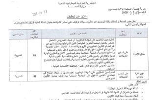 وزارة الصحة والسكان وإصلاح المستشفيات مديرية الصحة والسكان لولاية تيميمون ads إعلان عن توظيف يعلن مدير الصحة والسكان لولاية تيميمون عن تنظيم مسابقات توظيف على أساس الشهادات بعنوان السنة المالية 2025 للالتحاق بالرتب المدونة ادناه: إعلان عن توظيف بالمجلس الأعلى للشباب: الجزائر العاصمة، البليدة، …