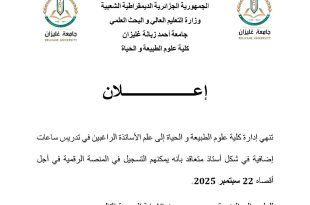 وزارة التعليم العالي والبحث العلمي جامعة أحمد زيانة غليزان كلية علوم الطبيعة والحياة جامعة غليزان ads إعــــــــــــــلان تنهي إدارة كلية علوم الطبيعة و الحياة إلى علم الأساتذة الراغبين في تدريس ساعات إضافية في شكل أستاذ متعاقد بأنه يمكنهم التسجيل في المنصة الرقمية في أجل …