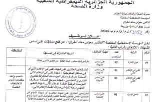الجمهورية الجزائرية الديمقراطية الشعبية وزارة الصحة مديرية الصحة والسكان لولاية الجزائر المؤسسة الاستشفائية المختصة الدكتور معوش محند أمقران بوزريعة ads إعلان توظيف تعلن المؤسسة الاستشفائية المختصة “الدكتور معوش محند أمقران”، عن فتح مسابقات على أساس الشهادة، للالتحاق بالرتب التالية: جميع مسابقات وإعلانات التوظيف نوفمبر …