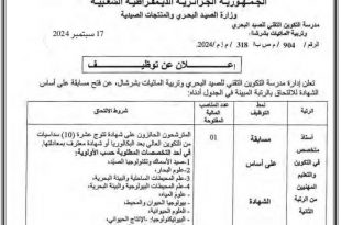 أكمل القراءة »إعلان عن توظيف بمدرسة التكوين التقني للصيد البحري وتربية المائيات بشرشال