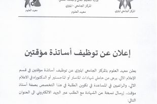 الجمهورية الجزائرية الديمقراطية الشعبية وزارة التعليم العالي والبحث العلم يالمركز الجامعي – ايليزي معهد العلوم ads إعلان عن توظيف أساتذة مؤقتين يعلن معهد العلوم بالمركز الجامعي ايليزي عن توظيف أساتذة مؤقتين في قسم الإعلام الآلي. يرجى من حاملي شهادات الماستر أو الماجستير أو الدكتوراه …