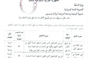 الجمهورية الجزائرية الديمقراطية الشعبية وزارة المالية المديرية العامة للميزانية ؤ ads إعلان توظيف عن طريق الانتقاء بناء على دراسة الملفات تعلن مديرية البرمجة ومتابعة الميزانية لولاية تيميمون عن فتح عمليات توظيف على طريق الانتقاء، بناء على دراسة الملف، للالتحاق بمناصب الشغل المبينة أدناه: منصب …