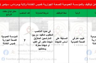 إعلان عن توظيف المؤسسة العمومية للصحة الجوارية خميس الخشنة ولاية بومرداس ads تعلن المؤسسة العمومية للصحة الجوارية خميس الخشنة ولاية بومرداس عن فتح توظيف في الرتب التالية: المؤسسةالرتبةالشروطمكان إيداع ملفات الترشحعدد المناصبنهاية آجال التسجيلاتالمؤسسة العمومية للصحة الجوارية خميس الخشنةطبيب عام للصحة العموميةشهادة دكتور في …