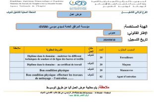 الجمهورية الجزائرية الديمقراطية الشعبية وزارة العمل والتشغيل والضمان الاجتماعي الوكالة الوطنية للتشغيل عرض عمل ads الهيئة المستخدمة: مؤسسة المرافق العمومية لسيدي موسى – EVSM الإطار القانوني: عمومي تاريخ التسجيل: 2024/09/18 مكان العملالعددالمنصب المطلوبالشروط المطلوبةتندوف20فراشوندبلوم في المجال – إتقان تقنيات اللحام وخطوط القضبان والشبكاتتندوف20بناؤوندبلوم في …