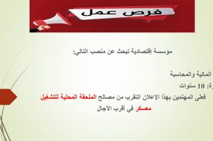 فرصة عمل ads مؤسسة اقتصادية تبحث عن منصب: مدير مالية ومحاسبة الشروط: خبرة لا تقل عن 10 سنوات في المجال المالي والمحاسبي. للتقدم للوظيفة: على المهتمين التوجه إلى مصالح الملحقة المحلية للتشغيل بمعسكر في أقرب الآجال. إعلان عن مسابقة توظيف بالمعهد التقني لزراعة البقول …