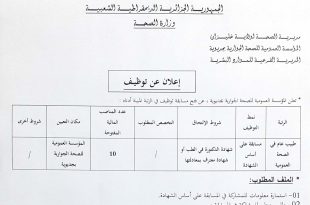 الجمهورية الجزائرية الديمقراطية الشعبية وزارة الصحة مديرية الصحة لولاية غليزان المؤسسة العمومية للصحة الجوارية بجديوية المديرية الفرعية للموارد البشرية إعلان عن توظيف ads تعْلَنُ المؤسسة العمومية للصحة الجوارية بحديوية، عن فتح مسابقة توظيف في الرتبة المبينة أدناه: عدد المناصبالماليةالمفتوحةطبيب عام في الصحة10العمومية الملف المطلوب: …
