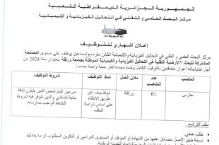 الجمهورية الجزائرية الديمقراطية الشعبية مركز البحث العلمي والتقني في التحاليل الفيزيائية والكيميائية إعلان اشهاري للتوظيف ads مركز البحث العلمي والتقني في التحاليل الفيزيائية والكيميائية الكائن مقره ببوإسماعيل يوظف على مستوى المصلحةالمشتركة للبحث “الأرضية التقنية في التحاليل الفيزيائية والكيميائية الموطنة بجامعة ورقلة ، بعنوان سنة …